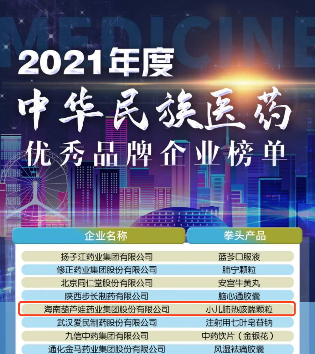12月29日,全国工商联医药业商会发布了“2021年度中华民族医药优秀品牌企业榜单”,PG国际药业集团凭借黄金单品小儿肺热咳喘颗粒(4克)实力登榜。